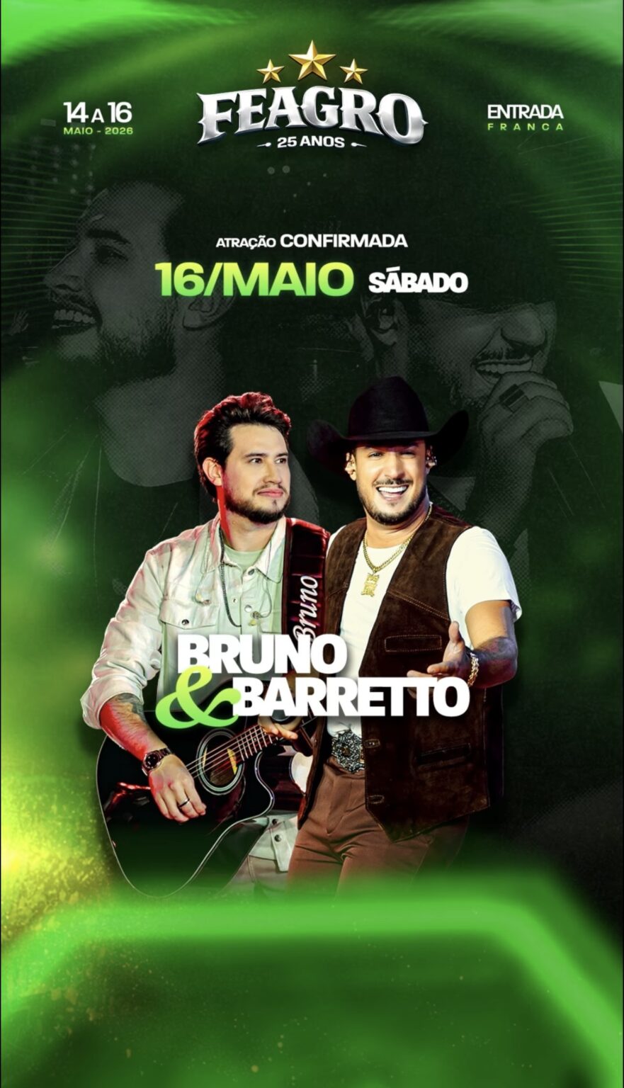 A organização da tradicional FEAGRO anunciou mais uma grande atração para a edição comemorativa de 25 anos do evento. A dupla sertaneja Bruno & Barreto está oficialmente confirmada para se apresentar no sábado, dia 16 de maio, durante a programação da feira em Comodoro. Reconhecidos nacionalmente por sucessos que marcaram o chamado “sertanejo bruto”, Bruno & Barreto prometem levar ao público um show animado e repleto de hits que conquistaram milhões de fãs em todo o país. A apresentação deve reunir uma grande multidão no parque de exposições, reforçando a expectativa de uma das noites mais movimentadas da feira. A…