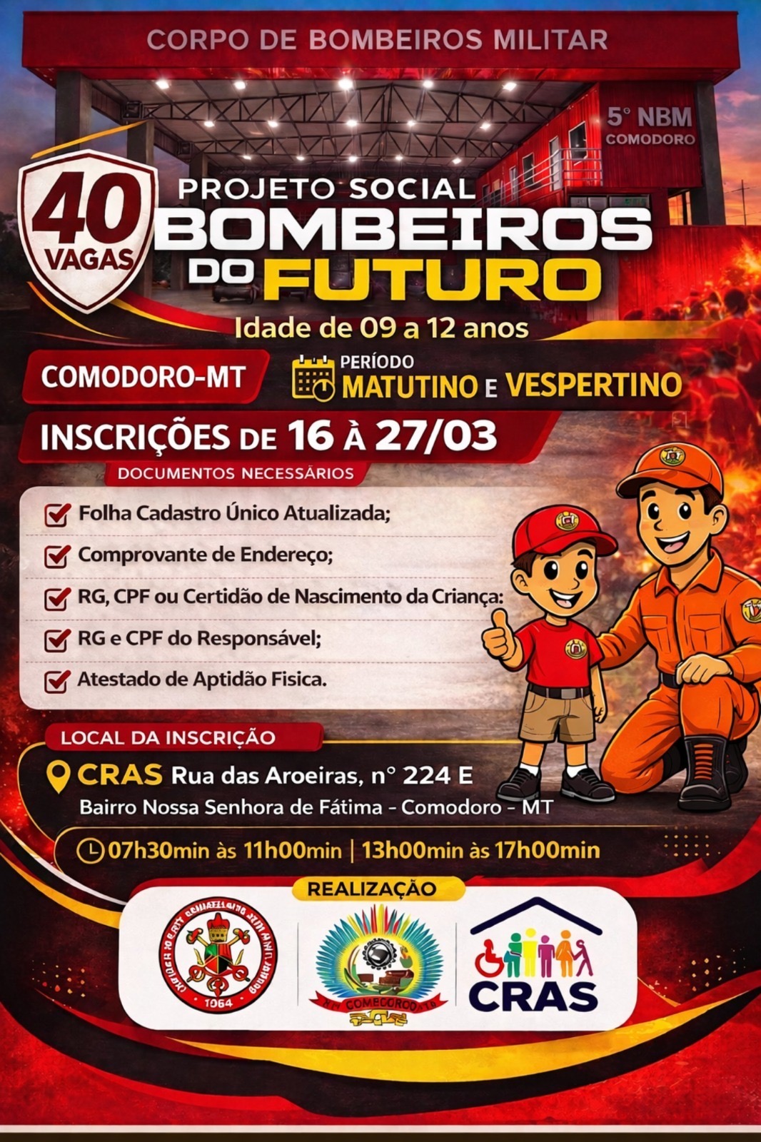 O Corpo de Bombeiros Militar de Mato Grosso, por meio do 5º Núcleo de Bombeiros Militar de Comodoro, abriu inscrições para o Projeto Social Bombeiros do Futuro, iniciativa voltada à formação cidadã de crianças do município. Ao todo, estão sendo disponibilizadas 40 vagas destinadas a crianças entre 9 e 12 anos de idade.
